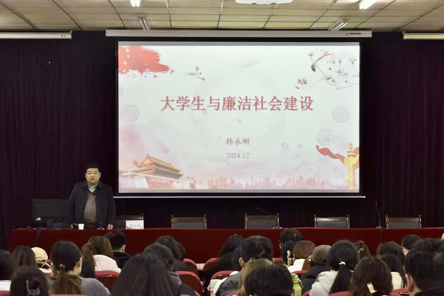 12月12日下午,校纪委书记韩永刚在英才校区E110会议室讲授题为“大学生与廉洁社会建设”专题思政课。学院全体辅导员和学生党员、入党积极分子、学生干部到场聆听,本次讲座由kaiyun体育网页登录入口党委副书记汪晓伟主持。