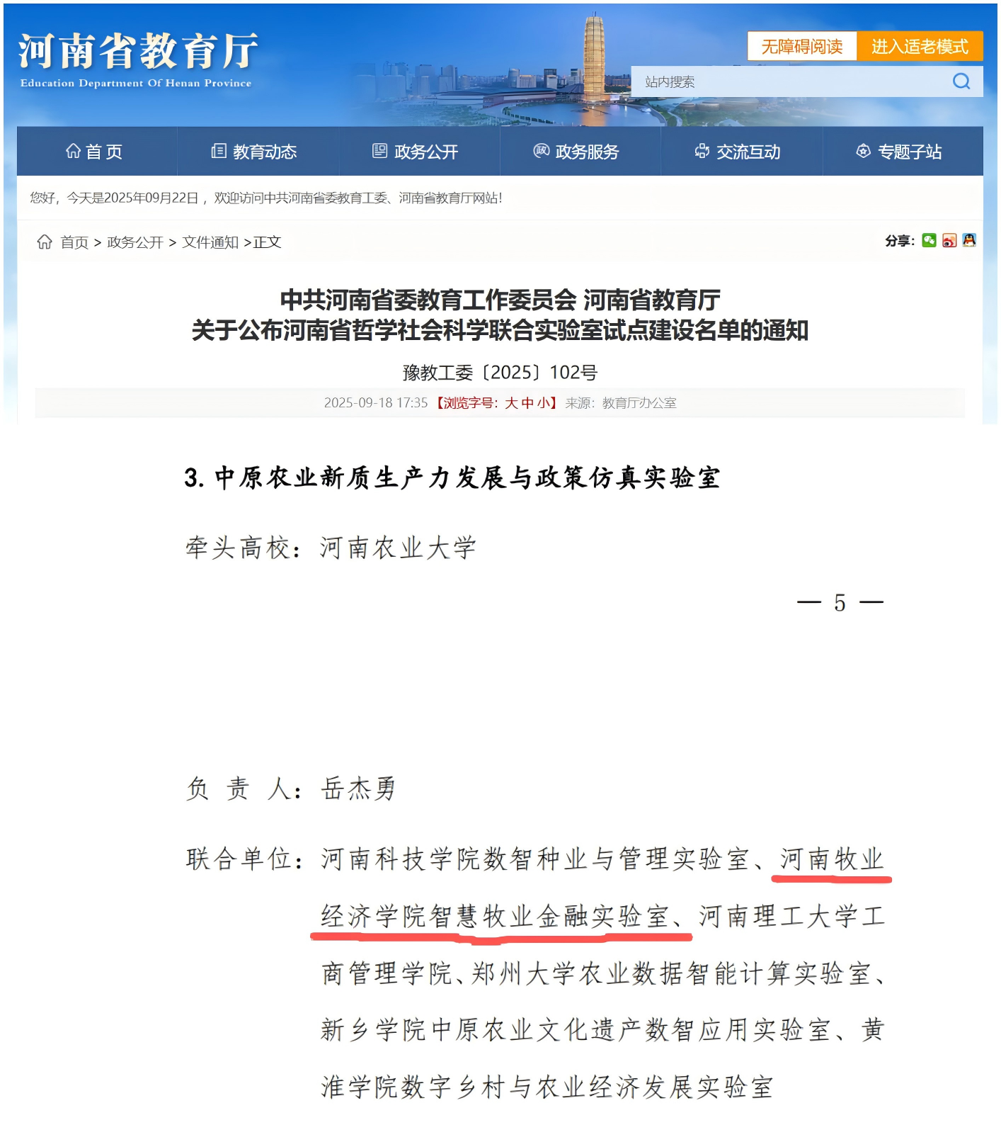 近日,中共河南省委教育工作委员会、河南省教育厅公布了首批河南省哲学社会科学联合实验室试点建设名单。由kaiyun体育官网作为主要协同单位联合申报的“中原农业新质生产力发展与政策仿真实验室”成功入选。