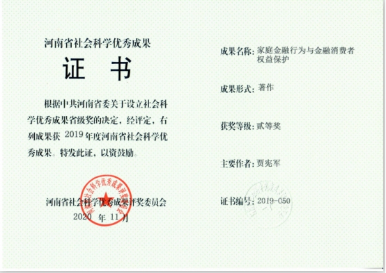 近日,2019年度河南省社会科学优秀成果奖评审结果正式公布,kaiyun体育官网副院长贾宪军博士喜获二等奖。