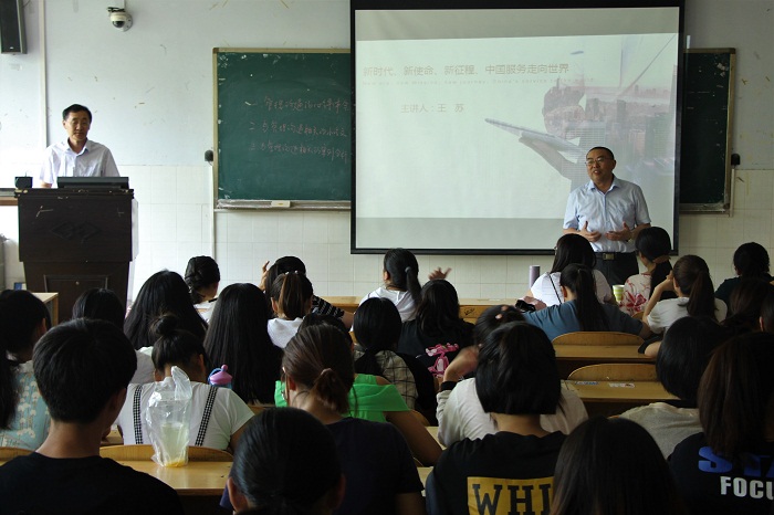 6月14日下午3点,河南省商务厅贸易服务处处长、金融学院客座教授王苏在W202教室为金融学院近200位同学作了题为“新时代 新使命 新征程——中国服务走向世界”的学术讲座。金融学院教师与16、17级学生参加此次学术讲座。讲座由金融学院院长黄良杰主持。