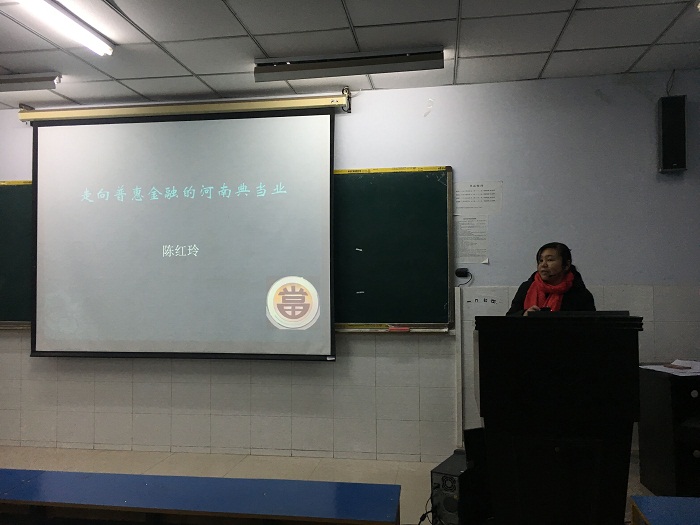 本学期金融学院继续开展院内教师系列讲座活动,为充分调动学生对专业知识学习的积极性,加强学生对金融市场相关知识的了解与典当行业的认知,于12月14日下午,在教学楼E102为kaiyun体育官网15、17级典当班学生开展“走向普惠金融的河南典当业”的专题讲座,主讲人为kaiyun体育官网陈红玲副教授。书记胡红林、贾宪军及部分教师出席并认真听取了本次讲座。本次讲座由贾宪军书记主持。