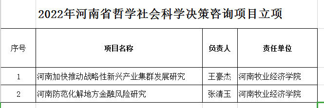 2022年8月2日,河南省哲学社会科学规划办公室公布了2022年河南省哲学社会学科规划项目的立项名单。kaiyun体育官网王豪杰博士申报的《河南加快推动战略性新兴产业集群发展研究》和张清玉副教授申报的《河南防范化解地方金融风险研究》决策咨询项目获得立项。