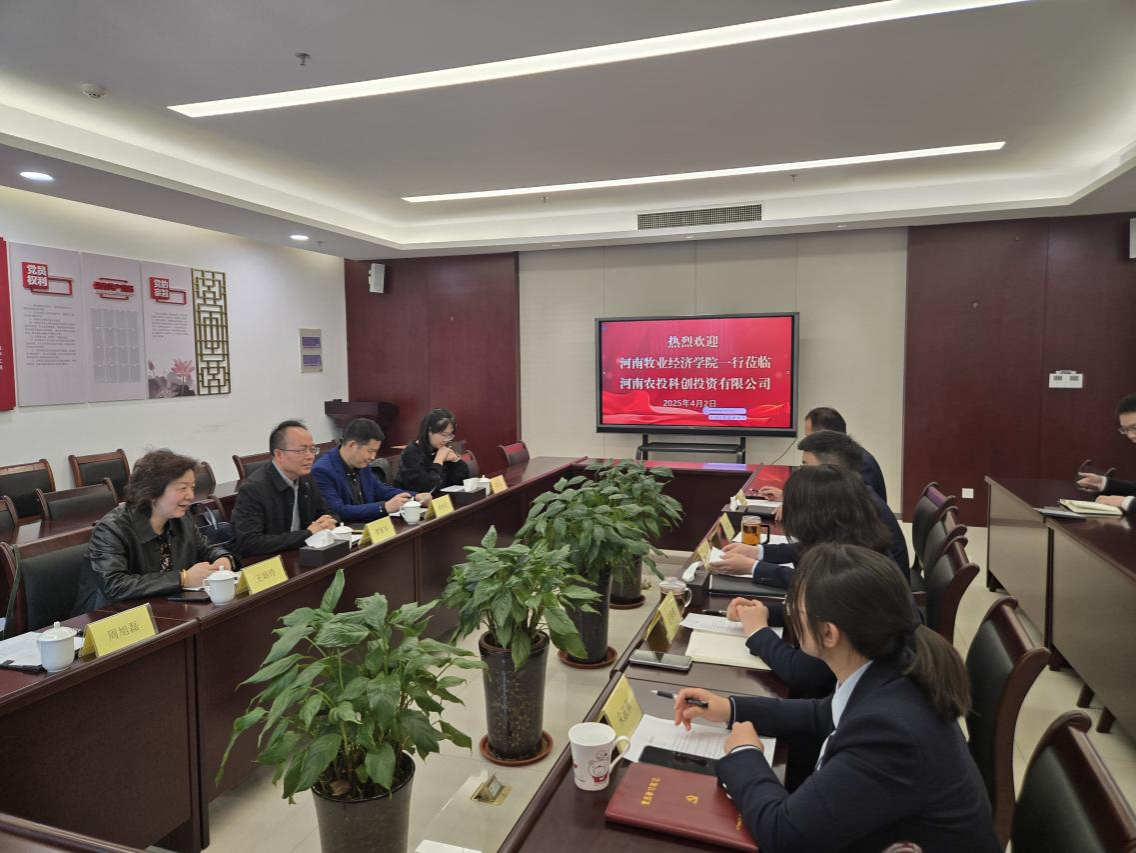 首先,贾院长一行来到农投科创,农投科创董事长李贞和、总经理助理王保侠和路明卫、人事部副部长宋淑佩热情接待。李董事长首先对贾院长一行人的到来表示热烈欢迎,并简要介绍了农投科创的基本情况。农投科创作为河南省农业投资集团旗下的科技金融平台,农投科创专注于农业科技创新项目的孵化和投资,在农业供应链金融、农业科技信贷等领域积累了丰富经验。贾院长就kaiyun体育官网近年来积极践行学校牧工商一体化发展思路,聚焦农牧业金融,取得的初步的建设成效进行介绍。希望以此次交流为契机,进一步加强沟通合作,从农牧金融社会服务、农牧原材料期货产品、农牧碳排放与碳汇核算等层面开展深度合作,共同推进“中原牧业金融联盟”、“智慧农牧业金融实验室”的建设;共建实习基地,为kaiyun体育官网学生提供农业科技金融领域的实习岗位,培养高质量毕业生。