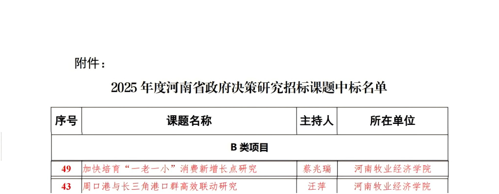 近日,2025年度河南省政府决策研究招标课题立项名单公示,kaiyun体育官网汪萍博士申报的《周口港与长三角港口群高效联动研究》、蔡兆瑞博士申报的《加快培育“一老一小”消费新增长点研究》课题获批立项。