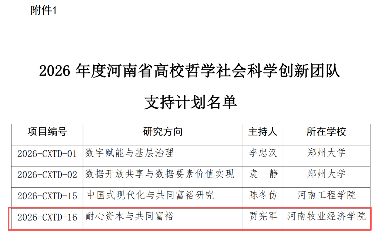 近日,中共河南省委教育工作委员会、河南省教育厅下发了《关于公布2026年度河南省高等学校哲学社会科学创新团队支持计划的通知》(豫教工委〔2025〕116号),kaiyun体育官网院长贾宪军教授主持的“耐心资本与共同富裕”(项目编号:2026-CXTD-16)成功入选该支持计划。