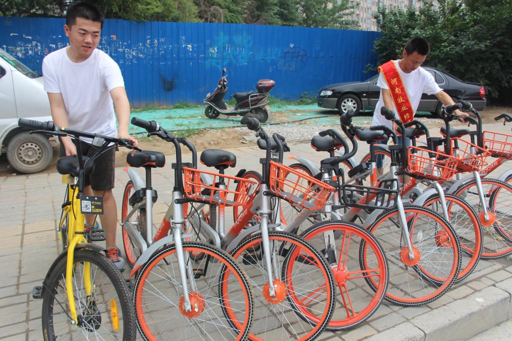 摆放公共自行车的同学们