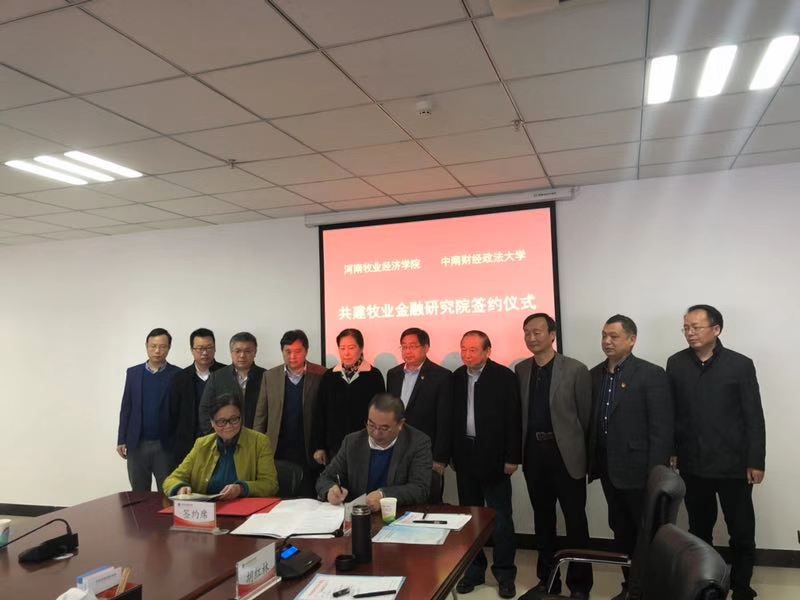 11月13日,河南牧业经济学院与中南财经政法大学共建牧业金融研究院的签约仪式在龙子湖校区图书馆841会议室召开,会议由副校长张卫宪主持。河南牧业经济学院校长罗士喜致辞,中南财经政法大学副校长姚莉致辞。参加签约仪式的人员有中南财经政法大学党政办主任阮世喜、产业升级与区域金融湖北省协同创新中心主任朱新蓉、副主任李春涛、副主任吕勇斌、研究员孙宪明;河南牧业经济学院党政办主任吕全建、发展规划处处长刘建铭、科研处处长邱国鑫、人事处处长吴静、金融学院党总支书记胡红林、金融学院院长黄良杰、金融学院党总支副书记、副院长贾宪军。经双方学校授权,黄良杰教授和朱新蓉教授代表双方学校签订了共建牧业金融研究院协议。